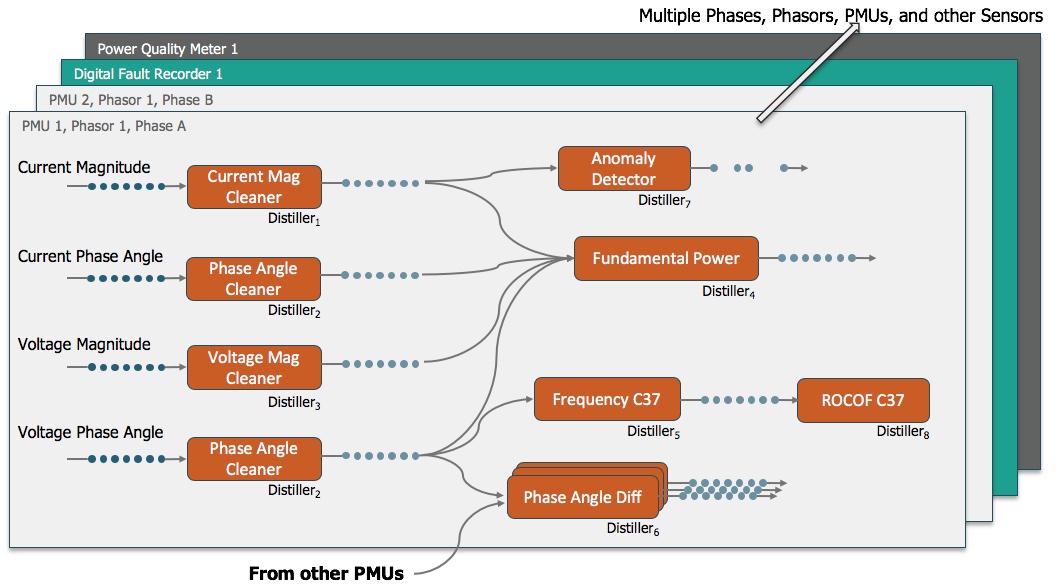 Moving computation to the data is one of the hallmarks of big data systems and processing time series data at scale is no different. Thus, analytics and machine learning must be core components or “first-class citizens” of the platform. This is one of the fundamental reasons why it is impossible to add or “bolt on” real time analytics, let alone machine learning capabilities, to legacy systems with non-scalable architectures. Further, processing real world sensor data at scale brings additional, unique challenges for analytics.The analysis of sensor data occurs in one of two modes: (1) real-time, processing the data as it arrives (synchronously) or (2) retrospective or historical, processing a fixed amount of the data after it has arrived into the system (asynchronously). Both require rapid processing of the data. However, real time (1) processing establishes an explicit time budget for each computation, much like rendering a three-dimensional scene in a movie or video game at 30 frames per second. For the movie or game to not stutter, each frame must be completed within 1/30 of a second. A sensor analytics platform that offers real time processing must offer such processing to all streams. While processing a single stream in real time may seem trivial, handling a million streams in real time is not and requires orders of magnitude additional computational resources and bandwidth. Retrospective or asynchronous processes often require the analysis of a large volume of data significantly faster than real time. Many traditional engineering analytics for sensor data apply a function to each data point or window of data points in one or more time series. A simple example of this is the calculation of frequency from phase angle data. Frequency is computed from a single input time series as the derivative of the phase angle measurement. A more complex analytic example is reactive power, which is computed from four measurement time series: the voltage and current phasors each consisting of a magnitude and a phase angle. However, analysis often requires the application of not one but a sequence of such functions. For example, a cleaning algorithm may first remove anomalous measurements from a voltage magnitude stream and then the “cleaned” version is passed through a function to compute the fundamental power. A universal sensor analytics platform must apply and orchestrate these types of functions in the appropriate sequence to thousands of data streams simultaneously while handling out-of-order updates to the individual data streams all in real time or to large historical data sets.