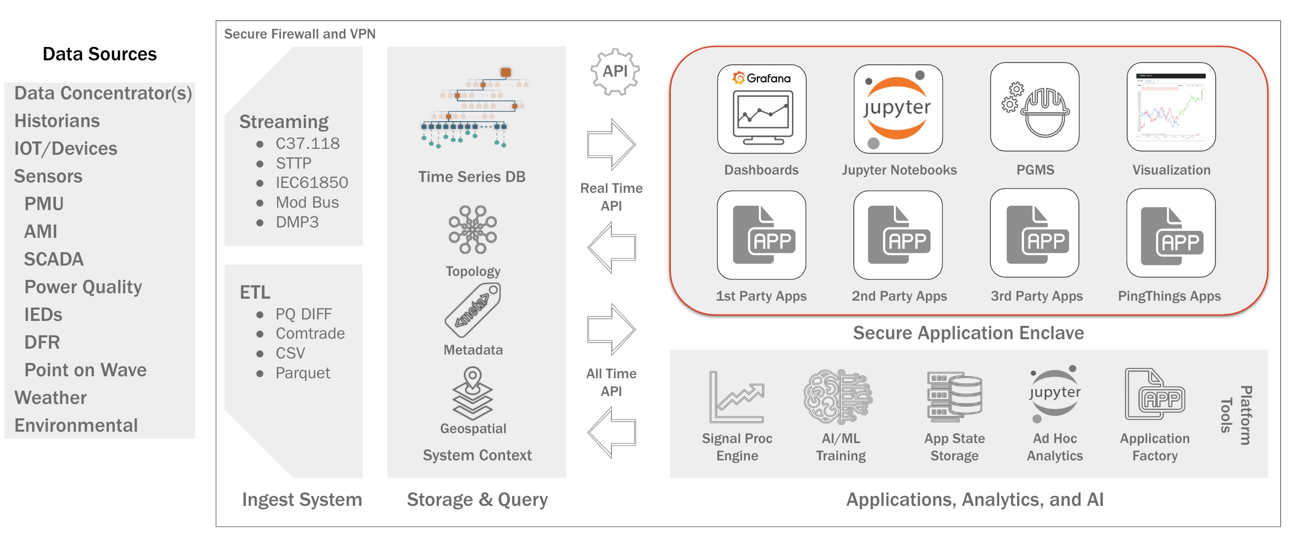 The platform can be decomposed into several functional areas. Moving from left to right in the diagram, it supports the ingestion of both streaming and historical data archives in a wide range of formats at scale via the ingest engine. Data is ingested into a database specifically designed for dense time series sensor data, the Berkeley Tree Database (BTrDB) whose development was funded by the ARPA-E Micro Synchrophasors for the Distribution System project. Further, the platform contains a distributed analytics and computational framework designed to operate across time series in parallel, executing significantly faster than real time to handle both real time and historical analyses and the training of machine learning and deep learning algorithms. The platform provides numerous APIs that provide not only a direct connection for web applications including a data explorer, dashboards, and Jupyter Notebooks for ad-hoc analytics but also to utility planning and operations software, allowing for the seamless integration of highly novel algorithms with the real world. The sections below will describe each component in detail.