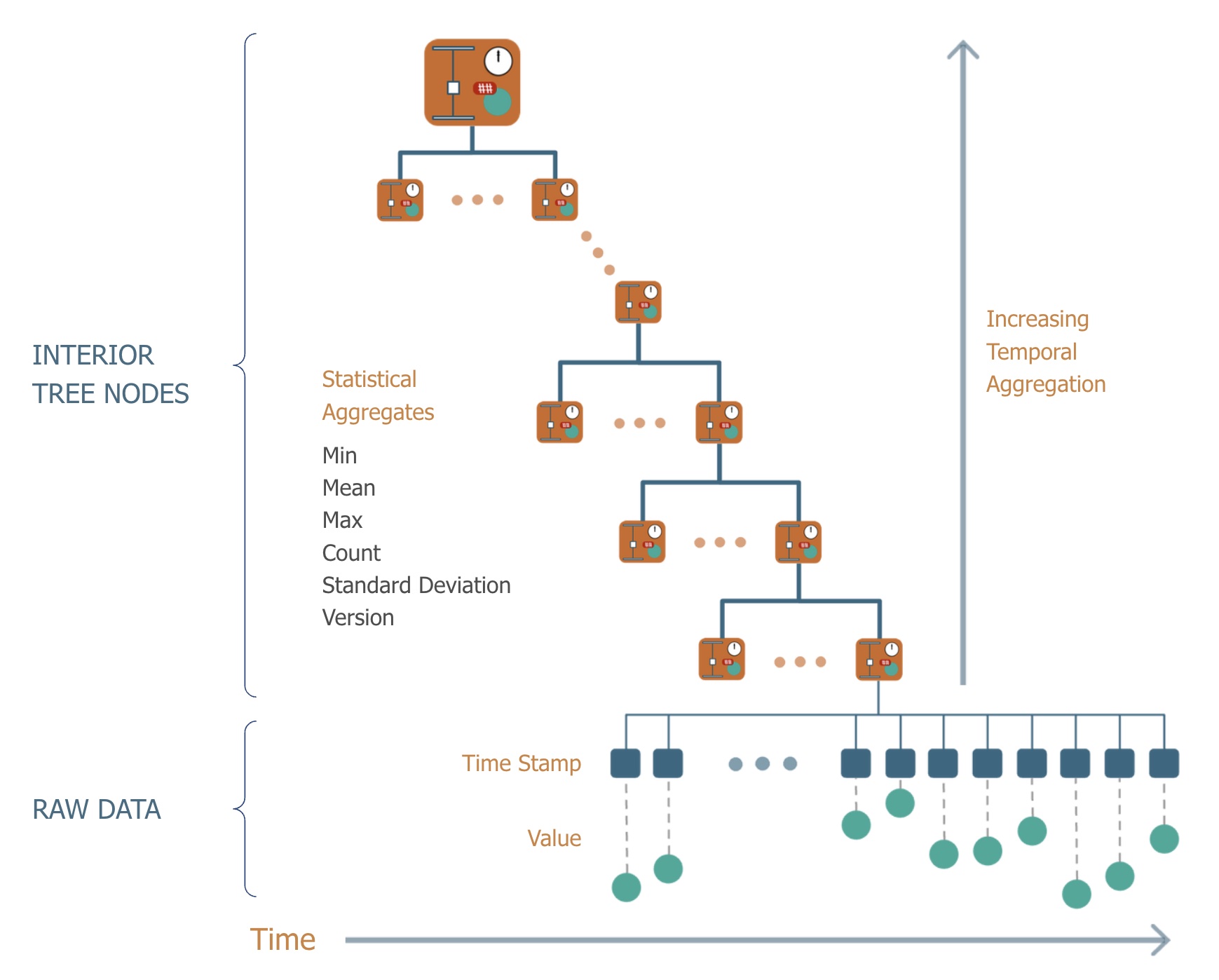 The raw measurements and timestamps are stored in the leaves at the bottom of this tree. Each